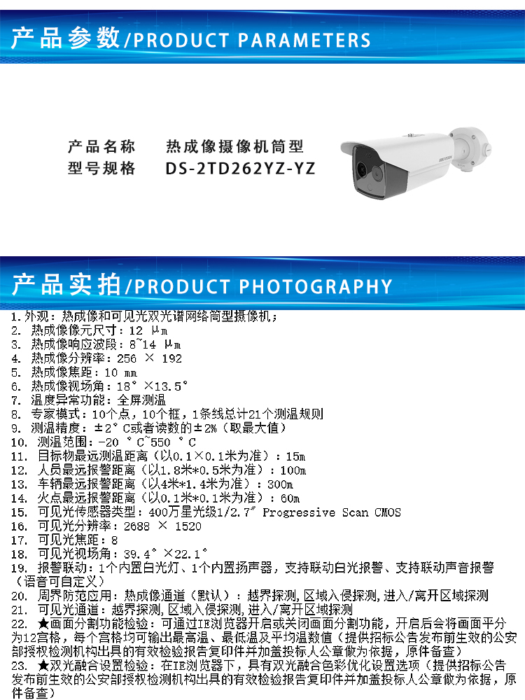 海康威视 热成像摄像机筒型 DS-2TD262YZ-YZ 含电源适配器+防雷接地 单位:台