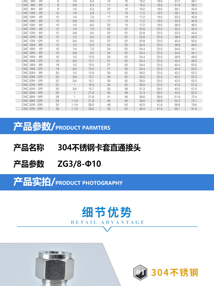 派瑞特 304不锈钢卡套直通接头 ZG3/8-Φ10 单位:个