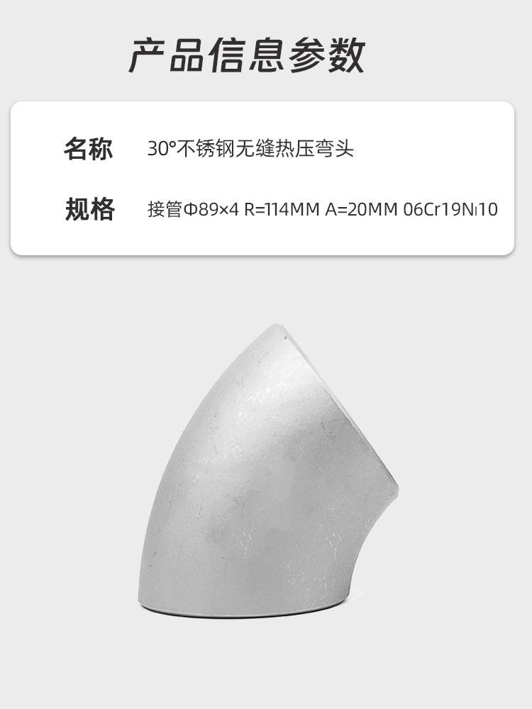 千鉴思 30°不锈钢无缝热压弯头 接管φ89×4 R=114mm a=20mm 06Cr19Ni10 单位:件