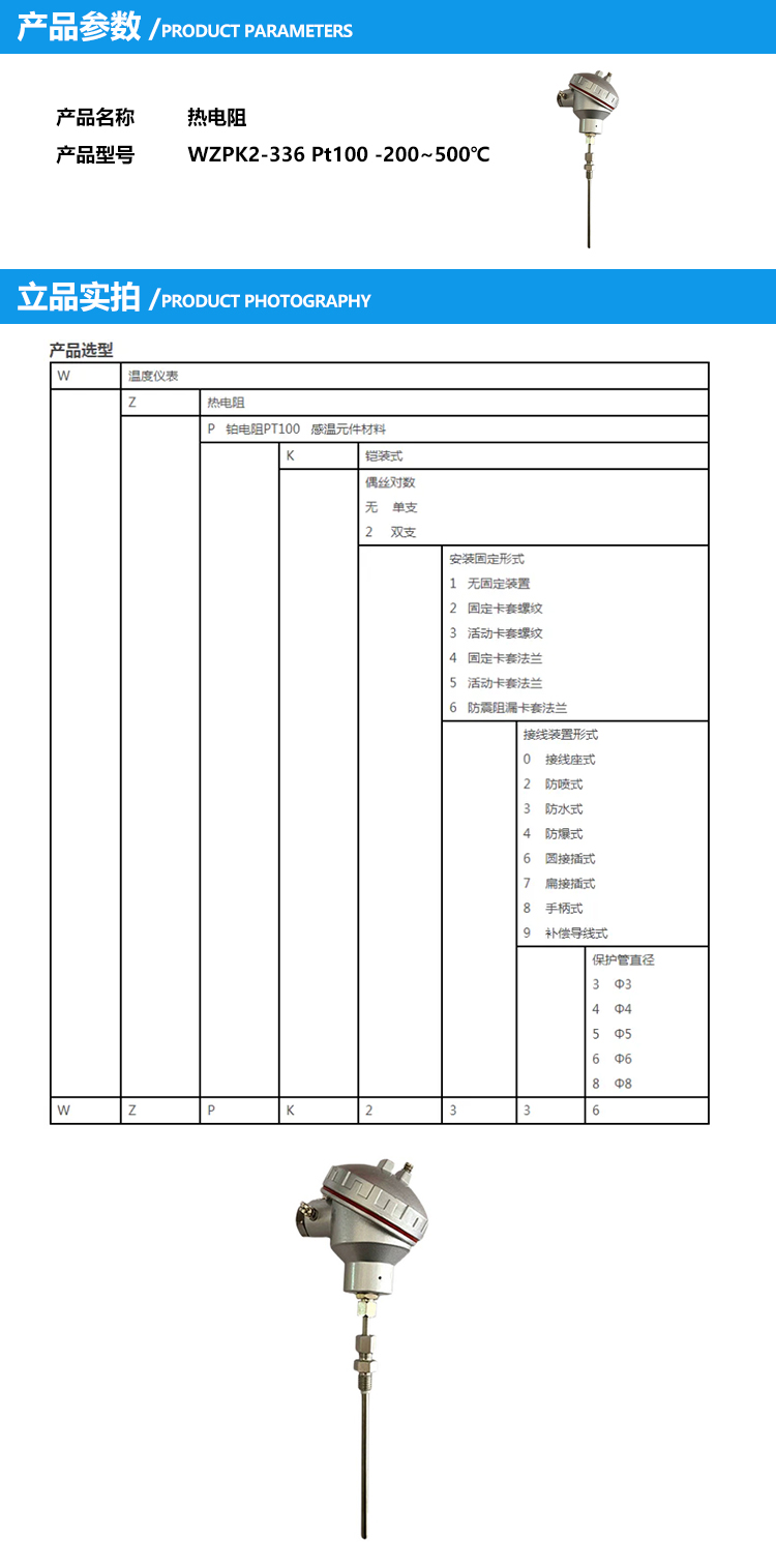 天康 热电阻 WZPK2-336 Pt100 -200~500℃ 单位:件